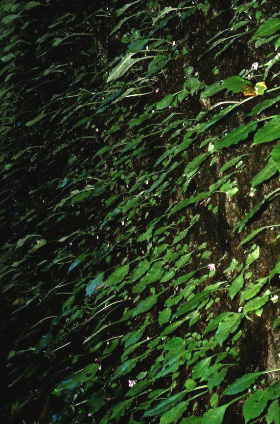 しかし、撮影は意外と難しく、肉眼で見たときは緑色の葉なのですが、特に光に当たった葉が、黄色(金色)に写ってしまうのです。特殊な波長の光を反射しているせいなのでしょう。それを消すのは大変です。偏光フィルターを使うことによってかなりの改善を見ることができました。