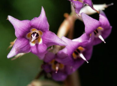 花は、5本の雄しべと1本の雌しべとからなりますが、雄しべの紫色の葯(やく:花粉を入れる袋状の部分)が合体して円錐形の塊となって雌しべの花柱を取り巻いています。