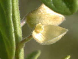 このScutellaria(スクテルラリア:タツナミソウ属)の類は、萼の形が特異で、上下の2唇が2枚貝のようになっており、果実が熟すと、上唇だけが散り落ちます。このとき残った下唇の様子が、右下の写真のように「小皿」なんです。この特徴を知っていると、萼を見ただけでタツナミソウ属の植物であることの見当がつきます。しかし、その後が大変です。似たような種類が多く、同定は困難を極めます。それでも、ナミキソウはわかりやすい種類です。