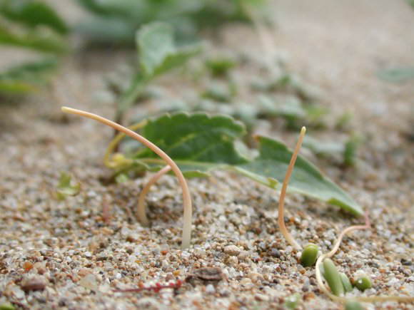 ネナシカズラは文字通り根の無い葛(つるくさのこと)です。発芽したときには、根も芽もよく分からないイトミミズみたいな、あるいは紐(ひも)のような蔓として伸びて、宿主となる植物を探します。図2は、加賀海岸で、砂の中から発芽して、宿主を必死で(?)探しているところです。手近な植物にまといつくと、寄生根を出して植物から栄養分を吸収するとともに、根が枯れていきます。 |