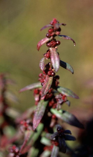 この果実は直径2mmくらいの小さなものですが、超小型のザクロを見るようで、とても綺麗なので、私の秋の楽しみの一つです。 田んぼや野原の日の当たる湿った場所でよく見られる1年生草本で、高さは20〜50cmくらいです。