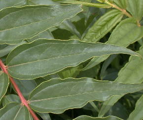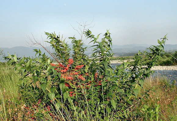 その名も恐ろしげなドクウツギは、海岸の荒れ地、河川敷、林道脇などに繁る落葉低木です。夏の日、赤い球形の果実が実ると、急に目立ちます。子どもが喜んで食べそうな赤い実ですが、別名イチロベゴロシ(市郎兵衛殺し)と言われるように、猛毒のアルカロイドを含んでいて、呼吸停止や心拍停止を引き起こす有毒植物です。最近はあまり聞きませんが、かつては新聞に時折、子どもが中毒死したとか、村人総出でドクウツギ退治をしたとの新聞記事を見たことがあります。下段の写真のように、3本の太い葉脈が縦に走っているのが特徴で、見極めは簡単です。