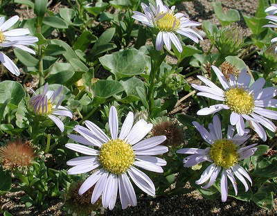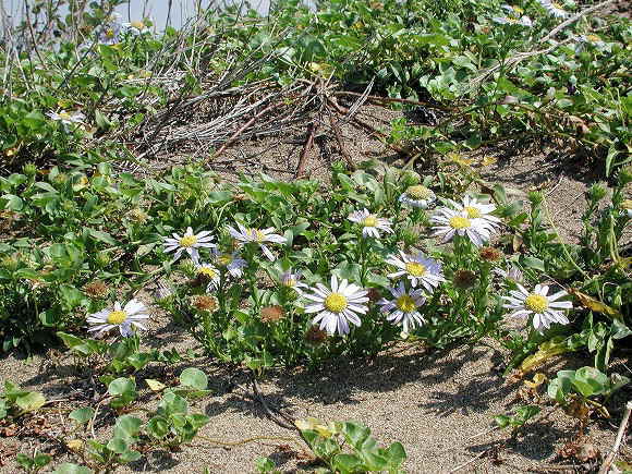 | 先日(平成13年9月26日)加賀海岸へ行きました。砂丘に白いものがちりばめられていました。そばへ寄ってみると、ハマベノギクの花盛りでした。 ここの砂丘は広いので、それぞれの株が根元で放射状(図2)に分枝(図3)して地を這い、ゆったりと展開していました。大きな株では、半径が80cmもありました(図1)。